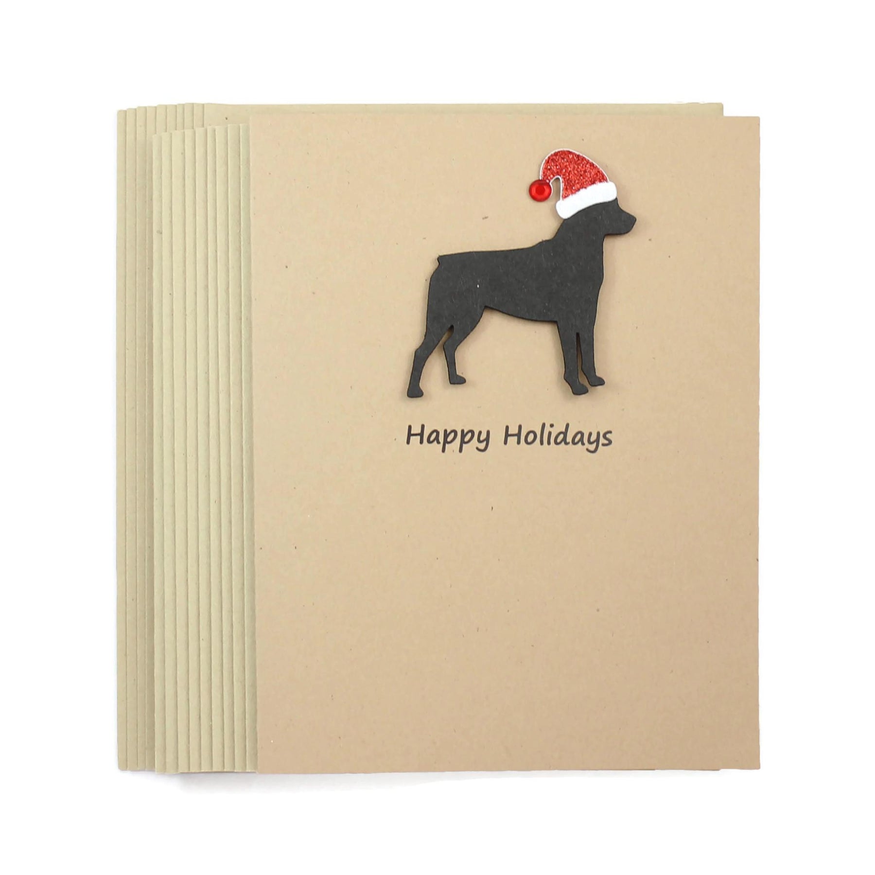 Calling all dog lovers! These simple but adorable holiday dog cards have been made from Kraft colored card stock. They are embellished with a black Rottweiler silhouette that has been die-cut out of black card stock and attached with foam adhesive to add dimension. A red sparkly Santa Hat has also been added.