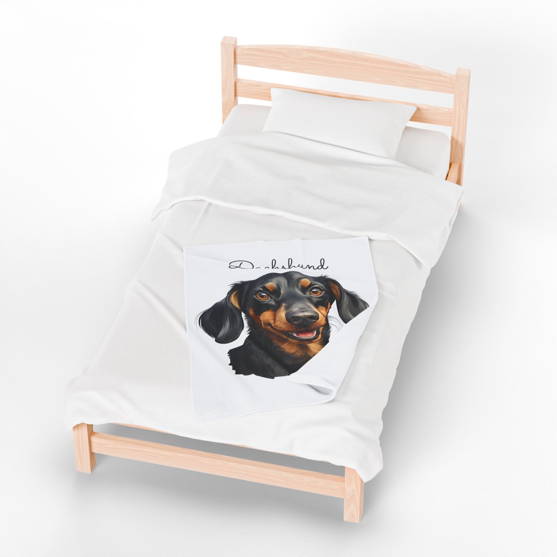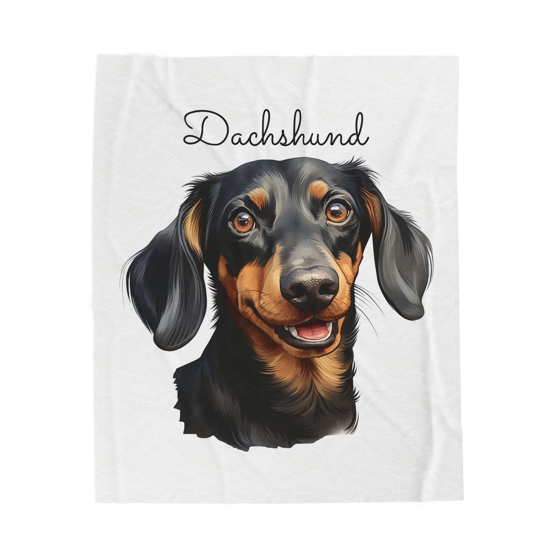 Wrap yourself in the comfort of this velveteen hug, showcasing the adorable face of a black and tan Dachshund against a crisp white backdrop. This plush blanket is softer than a cloud and perfect for turning any home into a warm and cozy haven.