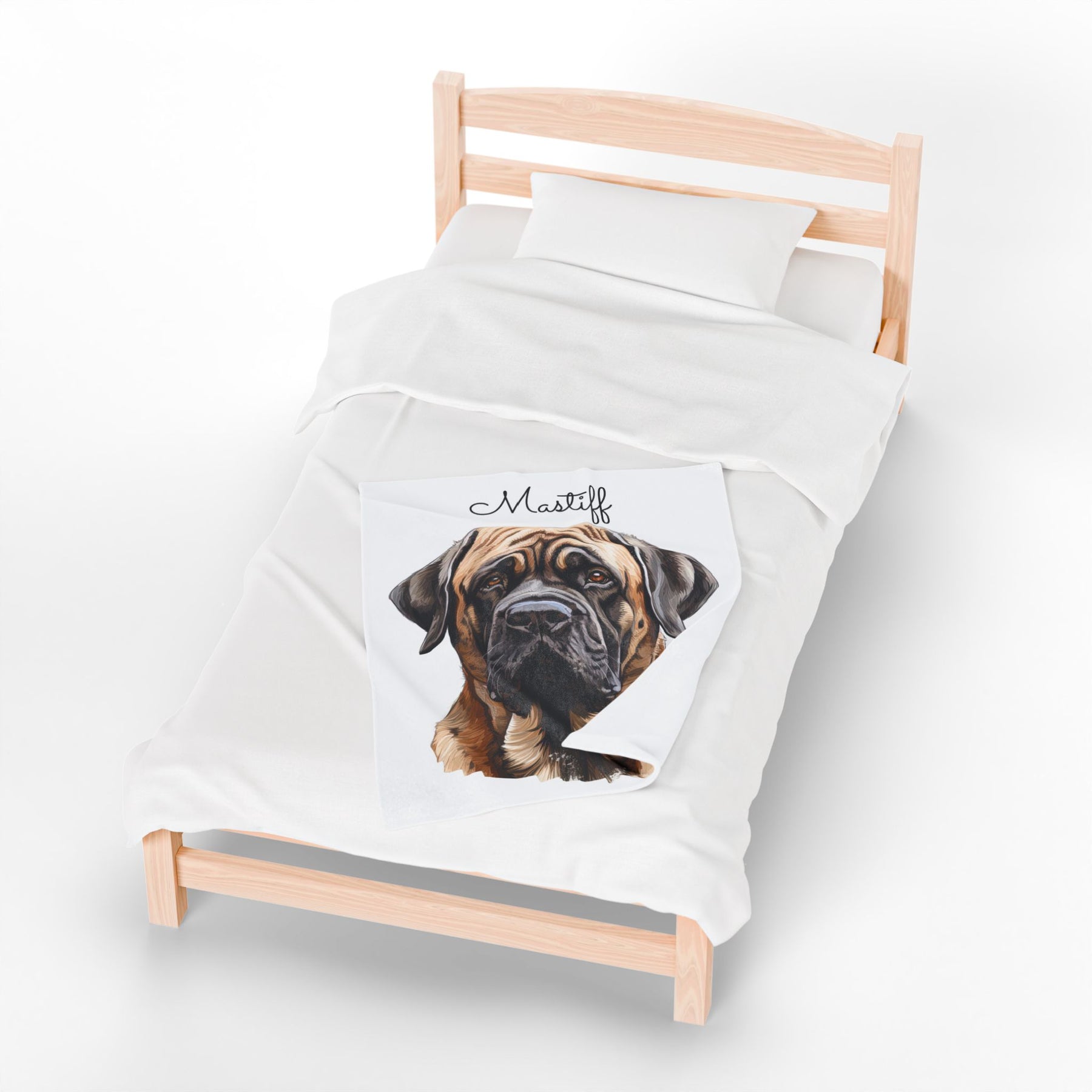Wrap yourself in the comfort of this velveteen hug, showcasing the adorable face of a Mastiff against a crisp white backdrop. This plush blanket is softer than a cloud and perfect for turning any home into a warm and cozy haven.