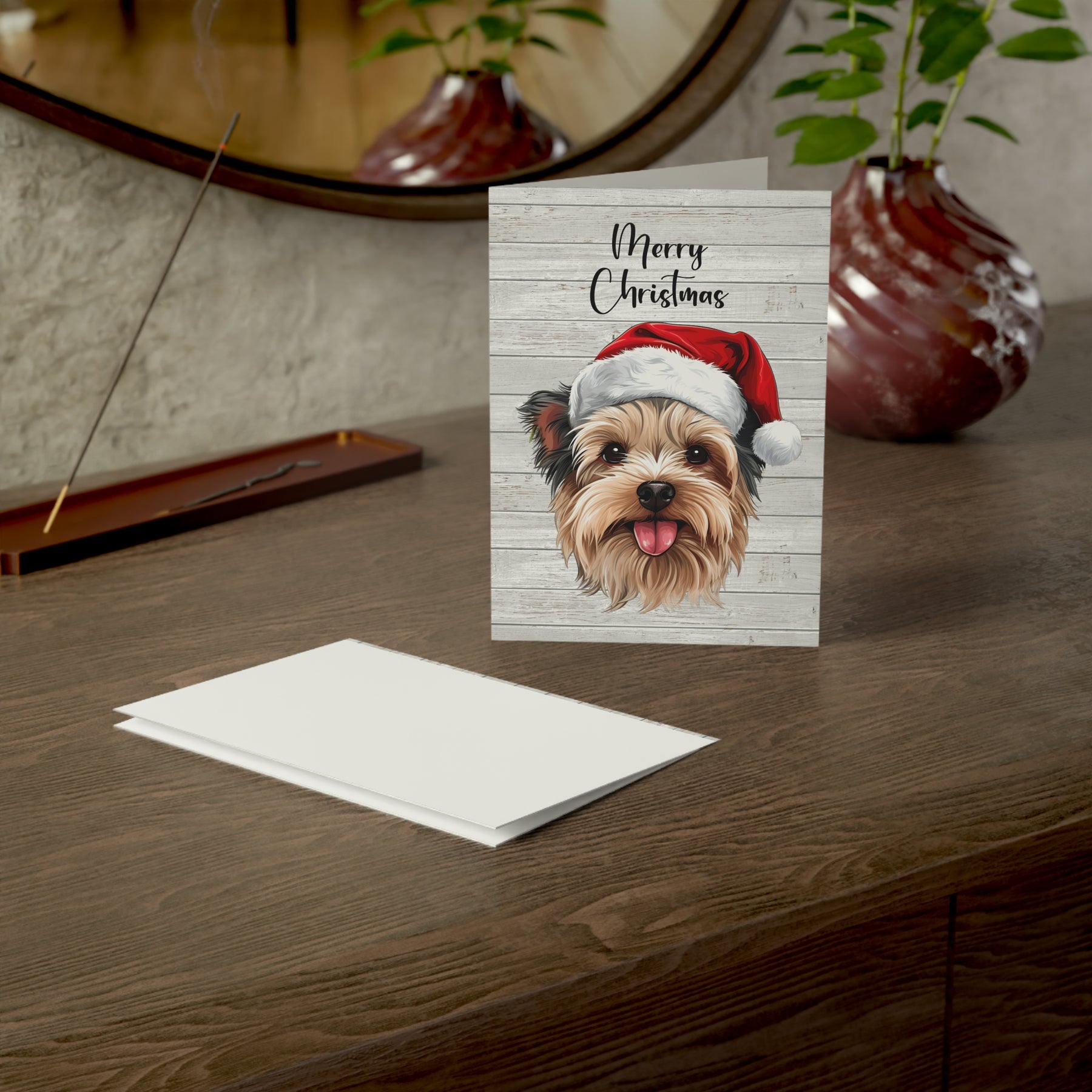 A personalized wish is the best one, especially when it comes on a customized greeting card like these. Adorable Yorkshire Terrier Dog Image with Santa Hat over a wood grain back ground. Merry Christmas in script font, blank on the inside. Printed on card stock, envelopes included.