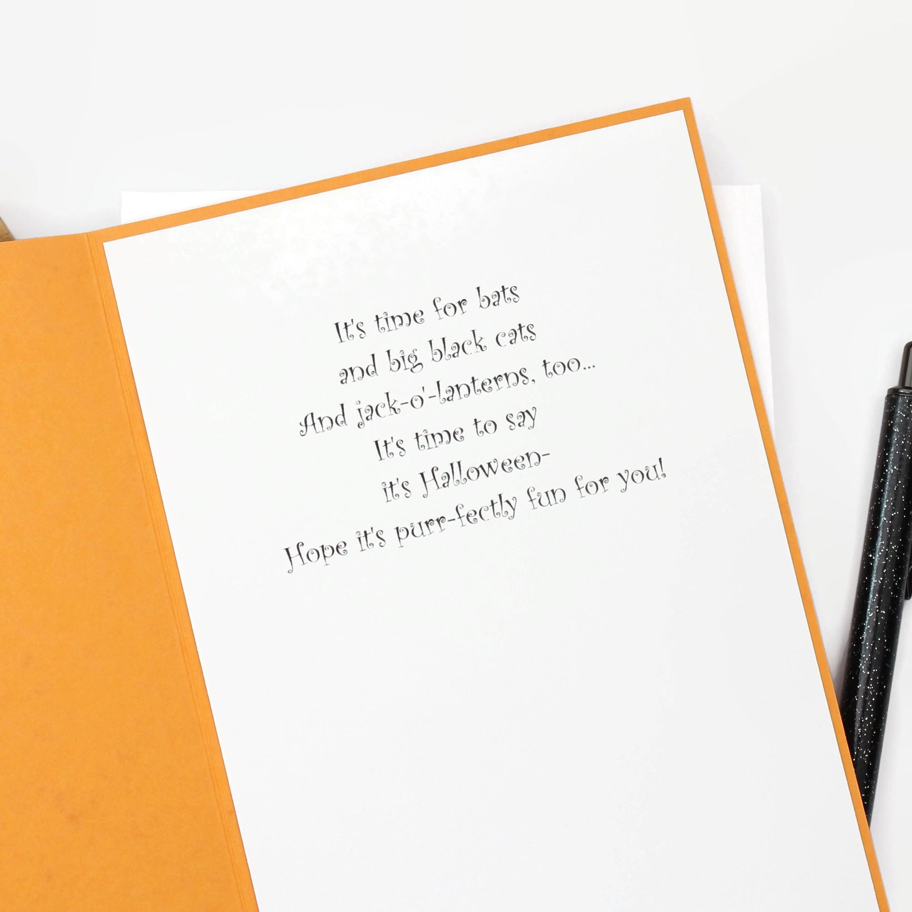Inside: It's time for bats and big black cats And jack-o'-lanterns, too... It's time to say it's Halloween- Hope it's purr-fectly fun for you!