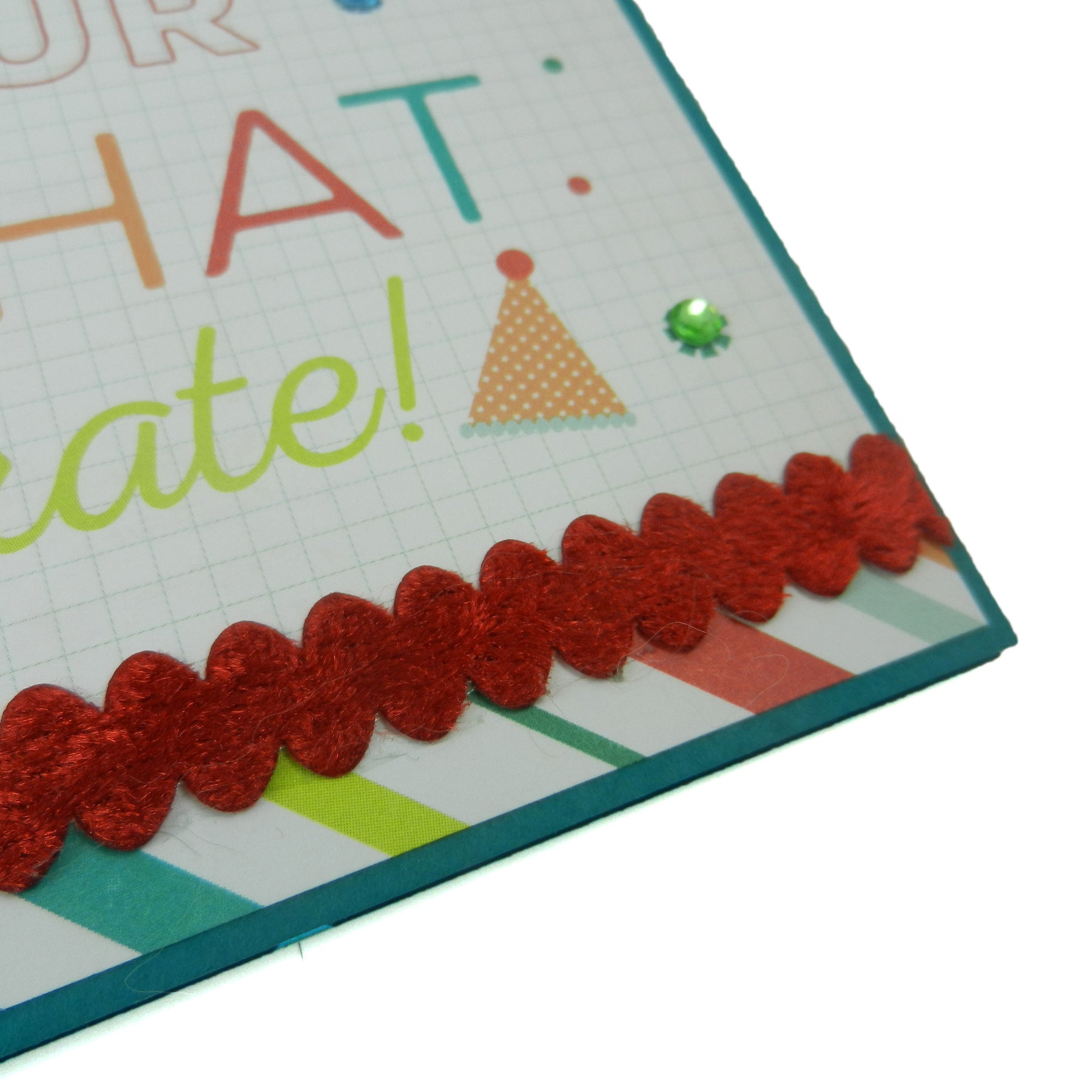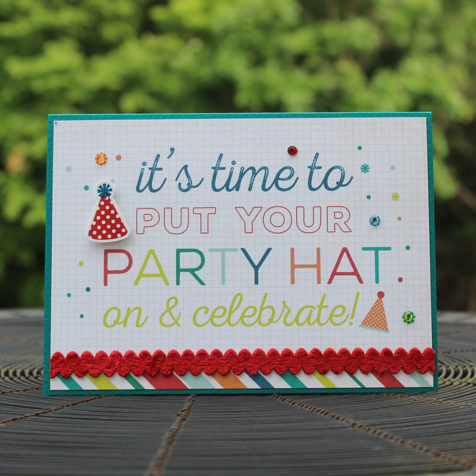 This bright colorful Birthday card is perfect for anyone! It's made from a teal card stock base. Patterned paper has been layered over the top with the saying "It's time to put your Party Hat on & celebrate!" A party hat has been attached with foam adhesive to add dimension. Colored gems have also bee added on the card. Stripped paper has been added to the bottom of the card under a velvet scallop ribbon. The phrase on the inside of the card is printed on white card stock and attached to the inside.